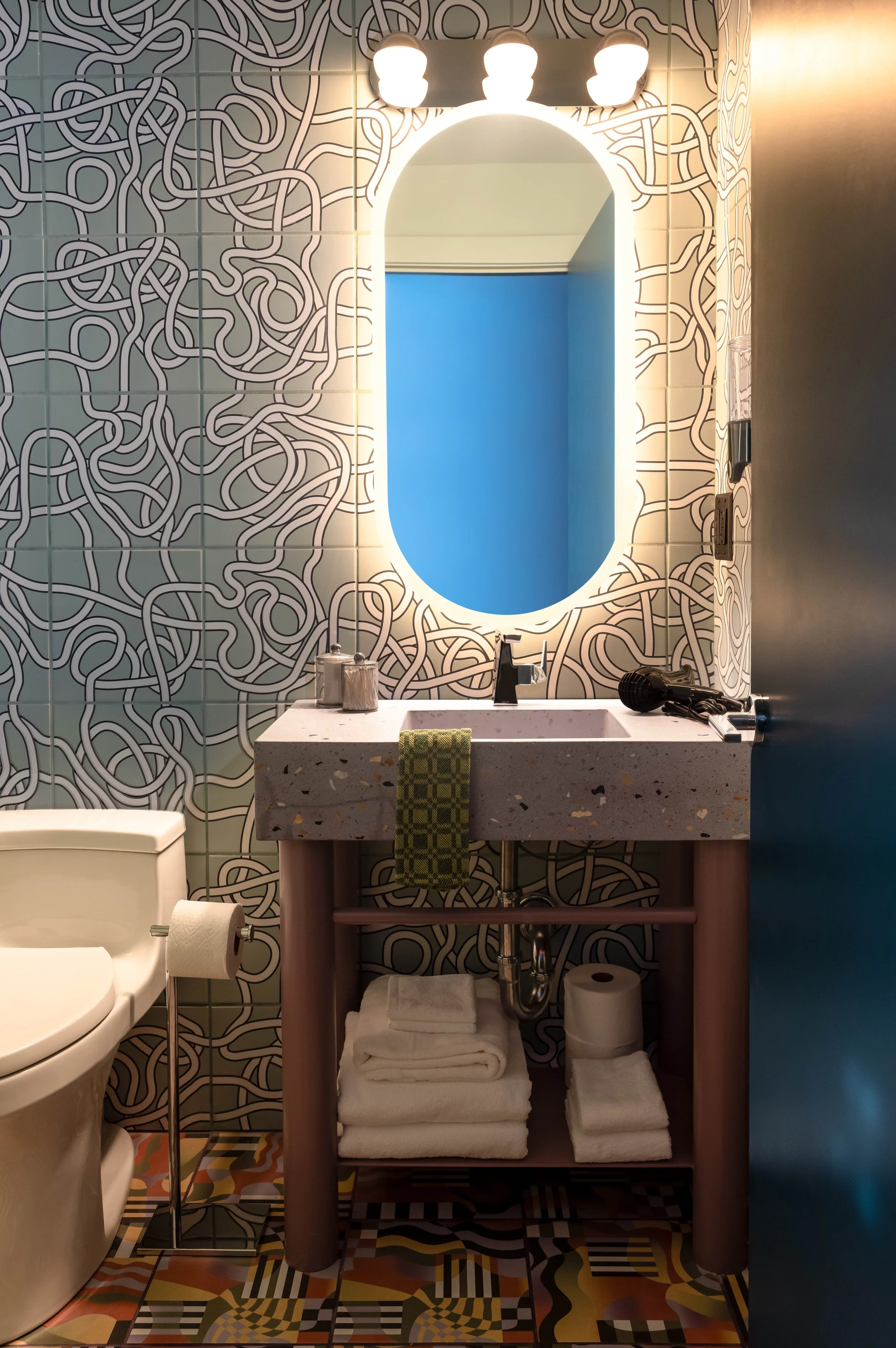Haustile’s distinctive tilework anchors the design, setting the tone for a visual narrative that moves through each room. The Gossip tile in black and white creates a crisp backdrop for beverage stations illuminated by futuristic sconces. In the guest rooms, Tangled in Sage and Gradient Stripes tiles add a sense of motion and warmth, their texture and geometry echoing the hotel’s joyful, maximalist spirit.