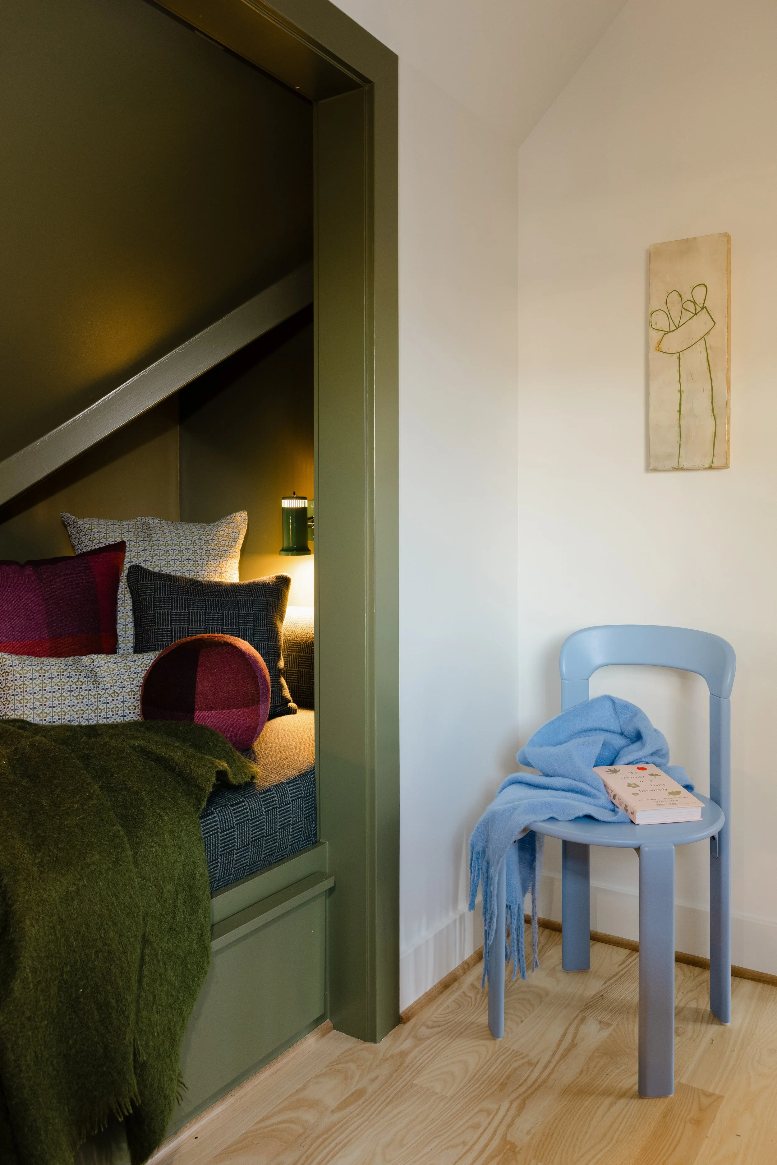 Furnishings from Pierce & Ward, House of Leon, and South Loop Loft contribute to the layered composition, while artwork by John Paul Kesling and Alex Conroy lends personality and depth. Textiles from Pierre Frey further soften the space, reinforcing a retreat that feels inviting without sacrificing clarity.
