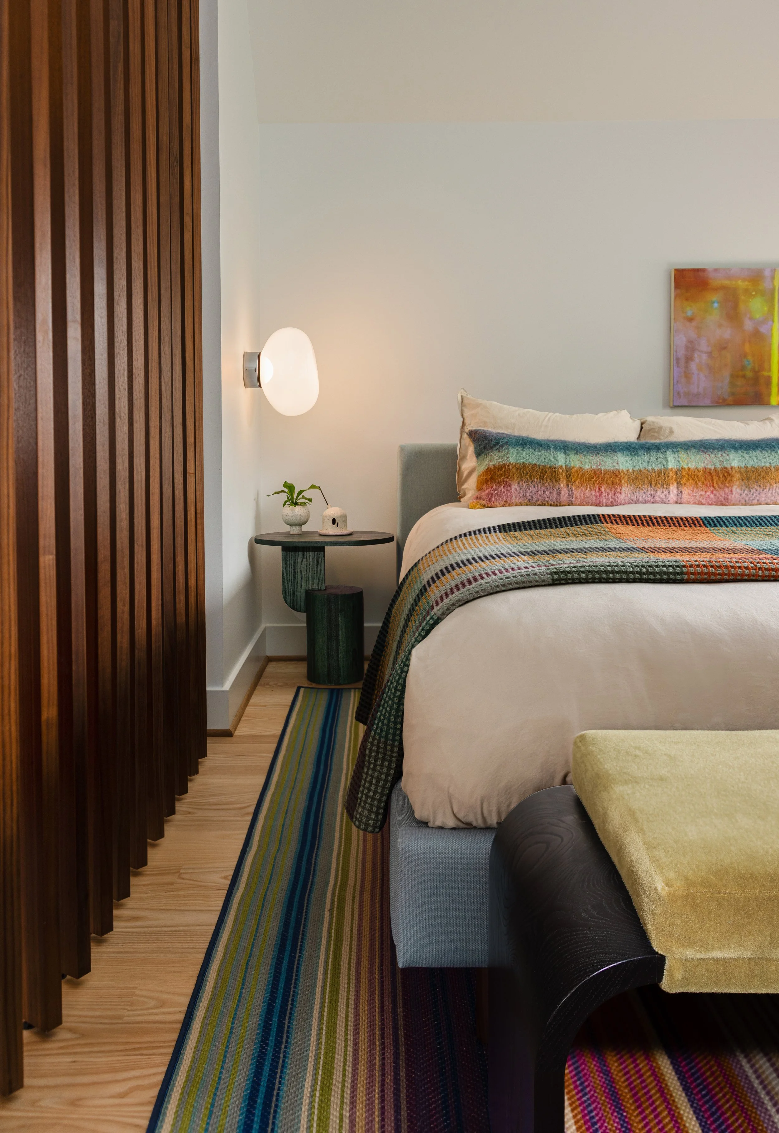 Rather than embracing minimalism, the interiors reflect a more European approach to simple living, where new and vintage pieces coexist to create a setting that feels intentional and collected. A slatted room divider serves as both a practical privacy screen and a defining architectural gesture, allowing openness to remain while introducing structure and visual rhythm.